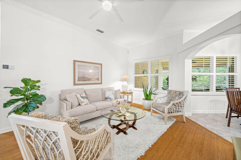 While some finishes reflect their era, it has been so well kept it still looks nearly new. The thoughtful floor plan delivers what buyers actually need: versatility, two living areas, bedrooms with space between, and a kitchen with storage and function at its core. Electric storm shutter on back covered porch makes it convenient during storms, while details like plantation shutters add a touch of style.
