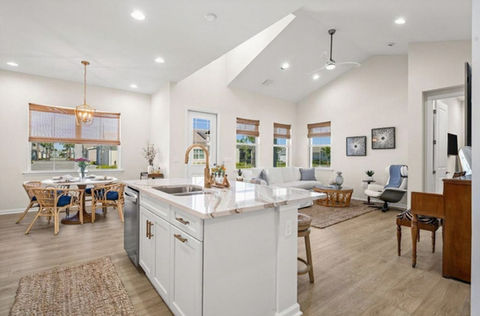 Step inside and you’ll see why these cottages have developed a devoted following - they’re bright, breezy, and brimming with character. Wood-style floors stretch beneath airy ceilings, white shaker cabinets sparkle against quartz counters, and sunlight dances through every room. With two bedrooms and a den, the layout is smart and stylish - all the space you need and none you don’t.