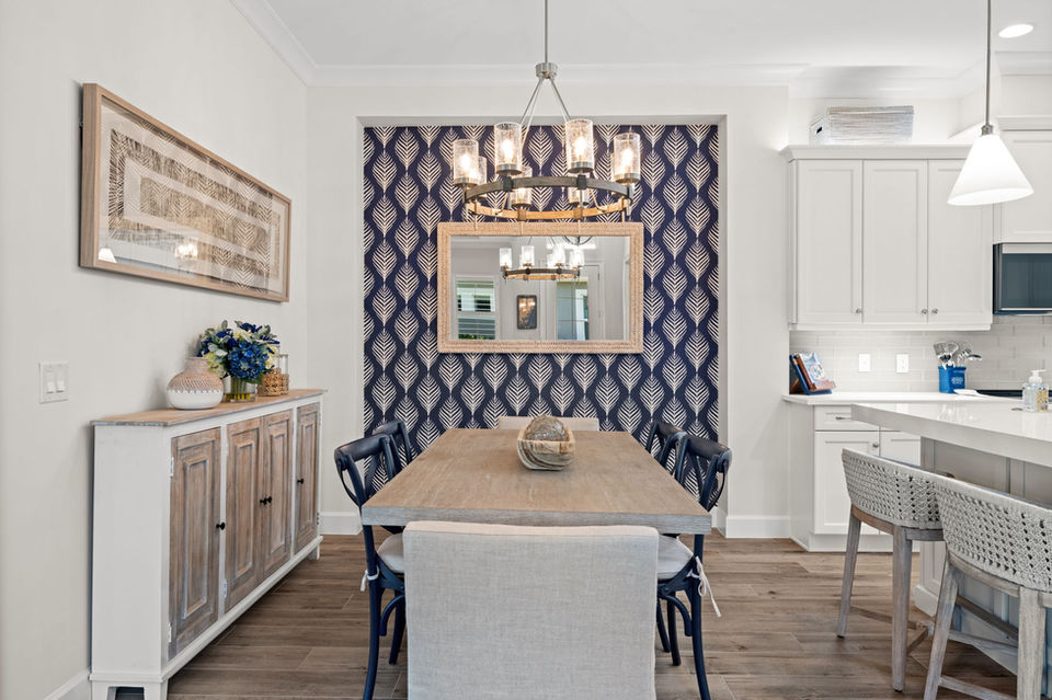 Wood-look tile flows seamlessly throughout the home, creating warmth and continuity. A stunning kitchen wall of custom cabinetry provides exceptional storage, complete with a thoughtfully designed niche that serves perfectly as a coffee or wine bar - both stylish and practical. High ceilings, coastal-inspired millwork, designer wallpaper, upgraded lighting, and curated finishes add character and charm at every turn.